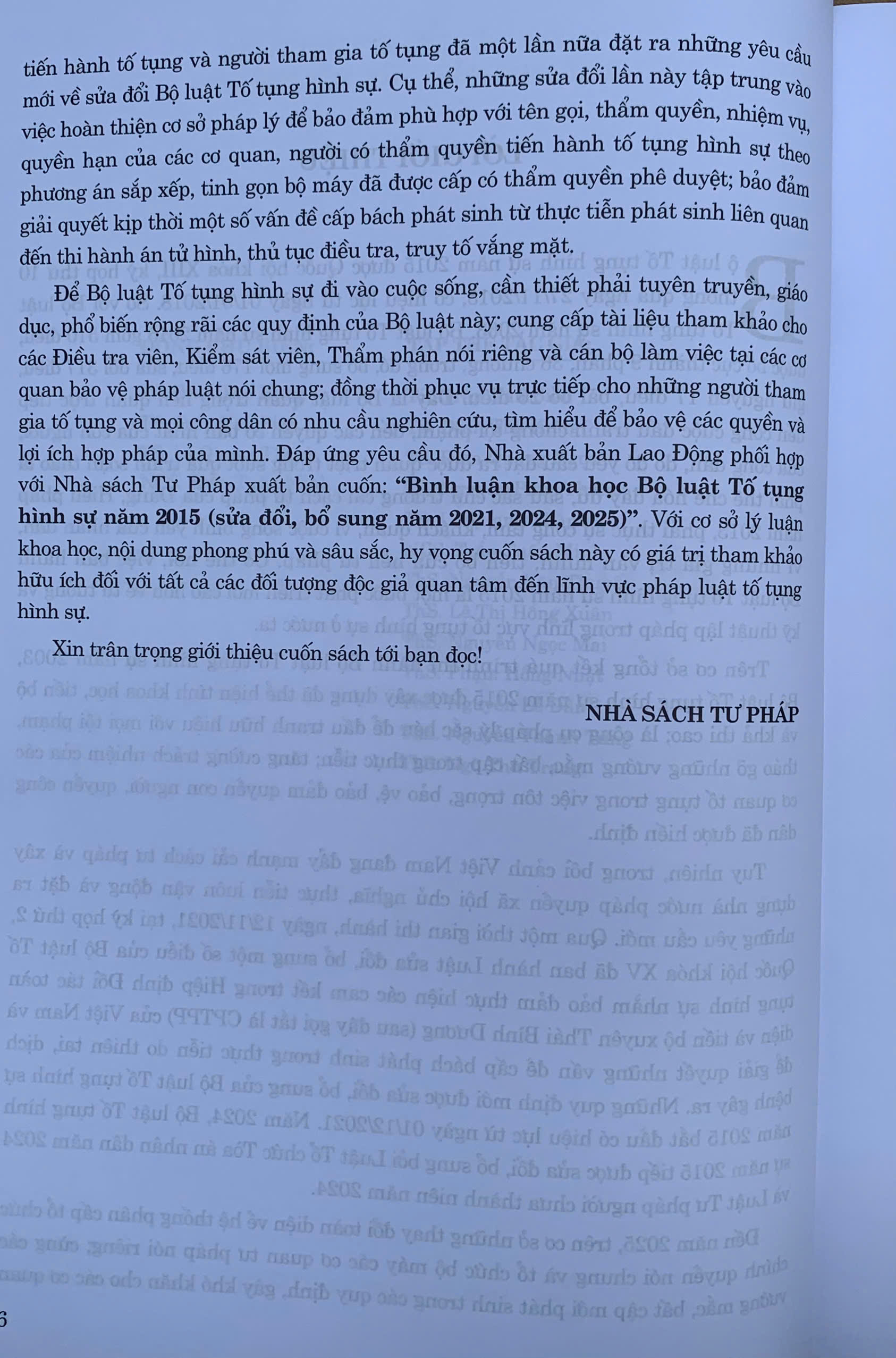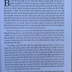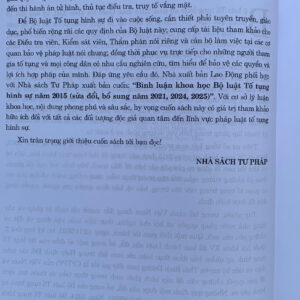 Để Bộ luật Tố tụng hình sự đi vào cuộc sống, cần thiết phải tuyên truyền, giáo dục, phổ biến rộng rãi các quy định của Bộ luật này; cung cấp tài liệu tham khảo cho các Điều tra viên, Kiểm sát viên, Thẩm phán nói riêng và cán bộ làm việc tại các cơ quan bảo vệ pháp luật nói chung; đồng thời phục vụ trực tiếp cho những người tham gia tố tụng và mọi công dân có nhu cầu nghiên cứu, tìm hiểu để bảo vệ các quyền và lợi ích hợp pháp của mình. Đáp ứng yêu cầu đó, Nhà xuất bản Lao Động xuất bản cuốn: “Bình luận khoa học Bộ luật Tố tụng hình sự năm 2015 (sửa đổi, bổ sung năm 2021, 2024, 2025)”. Với cơ sở lý luận khoa học, nội dung phong phú và sâu sắc, hy vọng cuốn sách này có giá trị tham khảo hữu ích đối với tất cả các đối tượng độc giả quan tâm đến lĩnh vực pháp luật tố tụng hình sự.