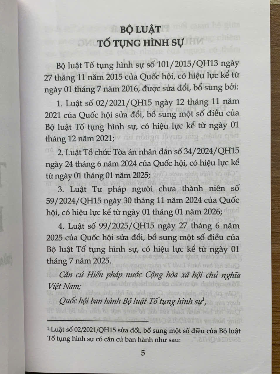 Bộ luật tố tụng hình sự năm 2015 (sửa đổi, bổ sung năm 2021, 2024, 2025) được biên soạn trên cơ sở Luật số 101/2015/QH13, đã được sửa đổi, bổ sung qua các luật sau: