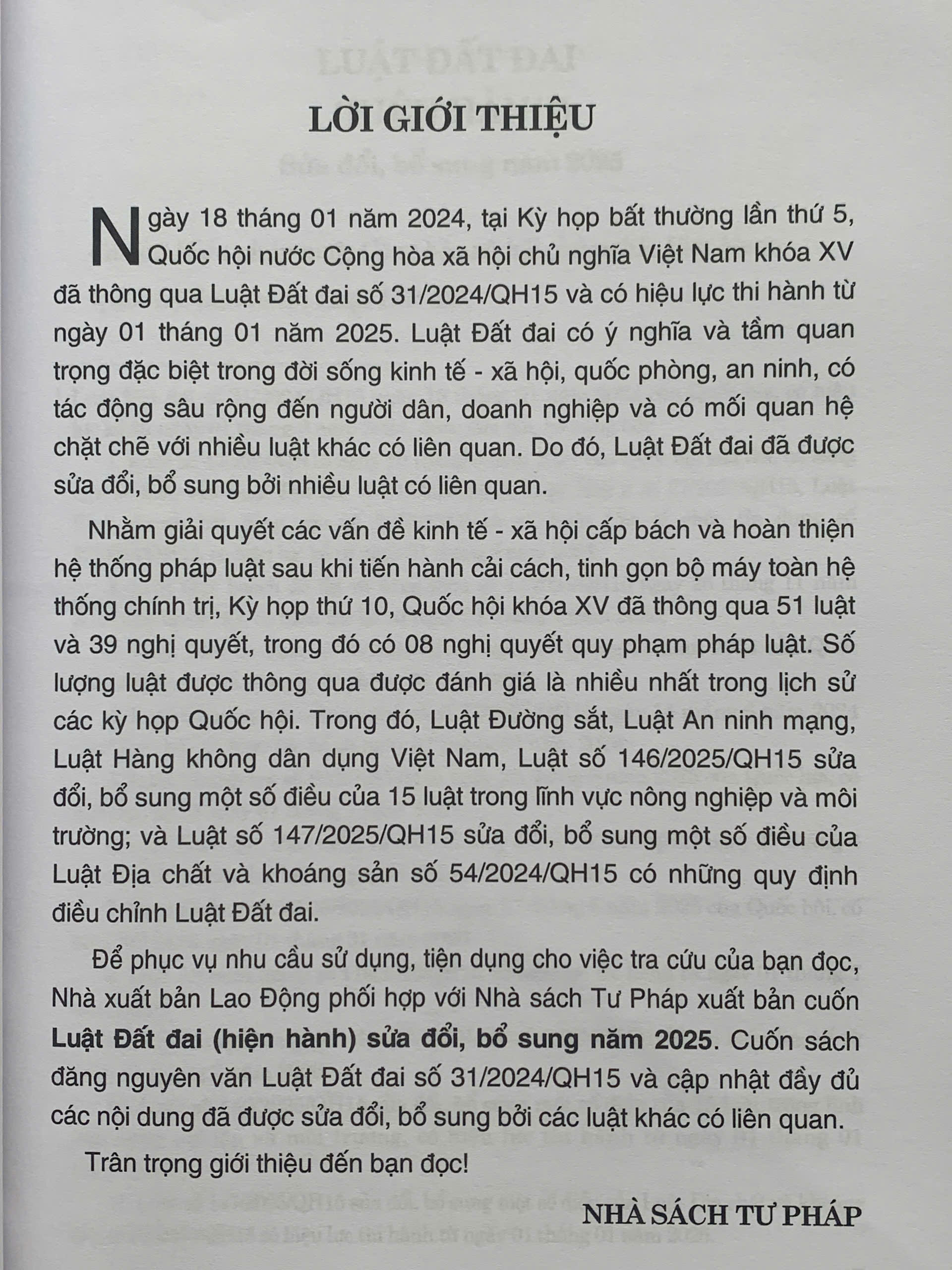 Để phục vụ nhu cầu sử dụng, tiện dụng cho việc tra cứu của bạn đọc, Nhà xuất bản Lao Động phối hợp với Nhà sách Tư Pháp xuất bản cuốn Luật Đất đai (hiện hành) sửa đổi, bổ sung năm 2025. Cuốn sách đăng nguyên văn Luật Đất đai số 31/2024/QH15 và cập nhật đầy đủ các nội dung đã được sửa đổi, bổ sung bởi các luật khác có liên quan.