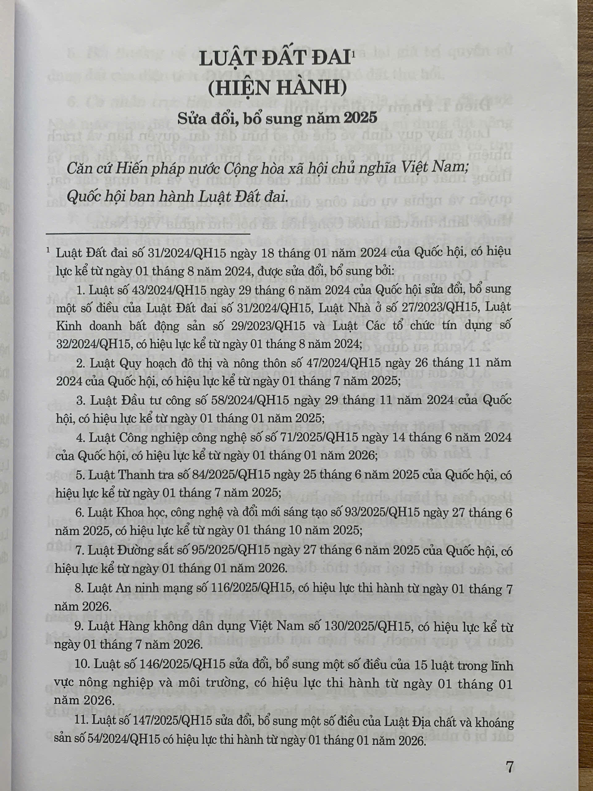 Luật Đất đai số 31/2024/QH15 ngày 18 tháng 01 năm 2024 của Quốc hội, có hiệu lực kể từ ngày 01 tháng 8 năm 2024, được sửa đổi, bổ sung bởi: