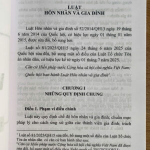 Cuốn sách Luật Hôn nhân và Gia đình năm 2014 (sửa đổi, bổ sung năm 2025) và các văn bản hướng dẫn thi hành là tài liệu pháp lý quan trọng, quy định toàn diện các vấn đề liên quan đến chế độ hôn nhân và gia đình; quyền, nghĩa vụ giữa vợ và chồng; quan hệ giữa cha mẹ và con; cũng như các vấn đề phát sinh trong thực tiễn như ly hôn, nuôi con, chia tài sản, xác định quan hệ huyết thống và hộ tịch.